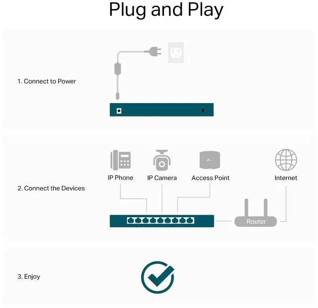 Enjoy effortless setup with the plug-and-play design. Each port utilizes auto-negotiation to automatically detect connected devices and adjust settings for maximum compatibility and performance.