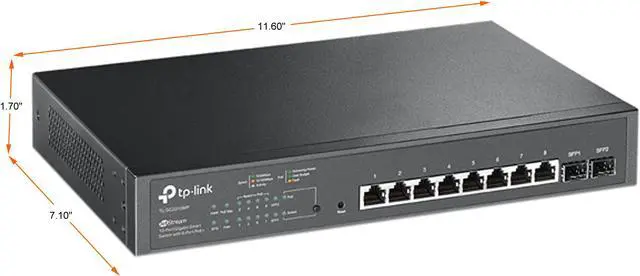8 x 10/100/1000 Mbps RJ45 Ports, all supporting PoE+ (Auto-Negotiation/Auto MDI/MDIX) 2 x 100/1000 Mbps SFP Slots