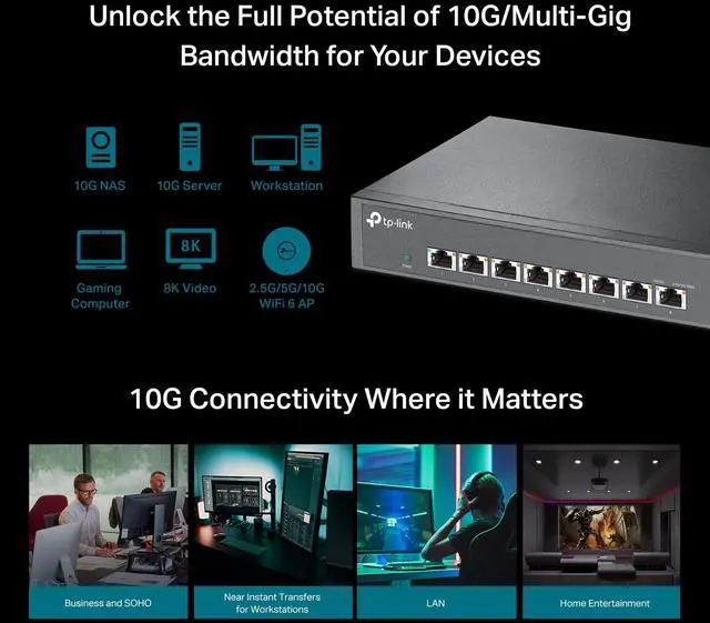 Whether you're working on a desktop computer, workstation, or connecting to a Wi-Fi 6 access point, the TL-SX1008 ensures a smooth, high-speed network experience. Unlock the full potential of Wi-Fi 6 with 10G wired connections, ideal for instant data transfer and backup to NAS storage. Experience the thrill of lag-free gaming with lower latency and prioritized gaming traffic through QoS, making your LAN parties smoother than ever. The TL-SX1008 also enhances your home entertainment experience, allowing you to enjoy buffer-free 8K videos for the ultimate movie night. With more 10GE LAN ports, you can expand your Wi-Fi 6 network and connect more devices, all running at maximum 10 Gbps.