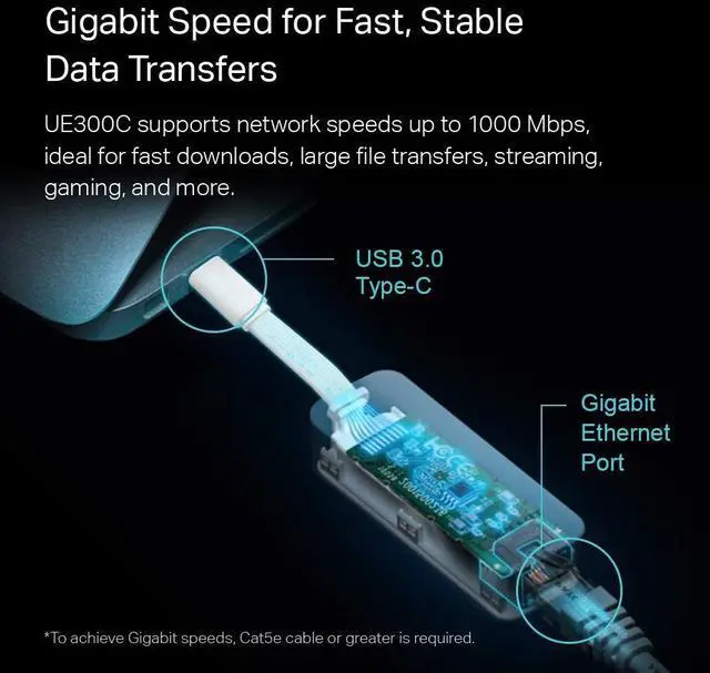 Equipped with a USB 3.0 port and Gigabit Ethernet port, UE300C supports network speeds up to 1000 Mbps, making it ideal for fast downloads, large file transfers, streaming, gaming, and more.