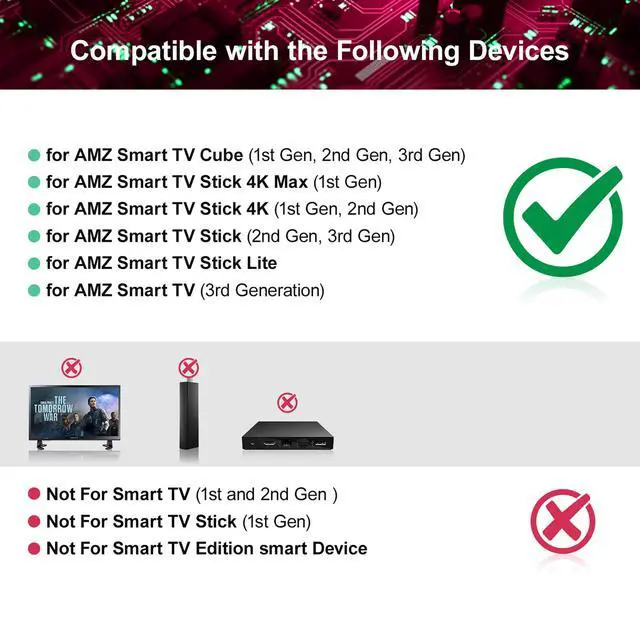 COMPATIBLE WITH: This voice replacement remote control is only compatible with smart TV stick 2nd Gen, smart TV stick 3rd Gen, smart TV stick 4K MAX, smart TV stick 4K 1st Gen, smart TV stick 4K 2nd Gen, smart TV cube 1st Gen smart TV cube 2nd Gen, smart TV cube 3rd Gen, smart TV 3rd Gen. To ensure full compatibility, please verify your device model matches our remote control specifications before placing your order