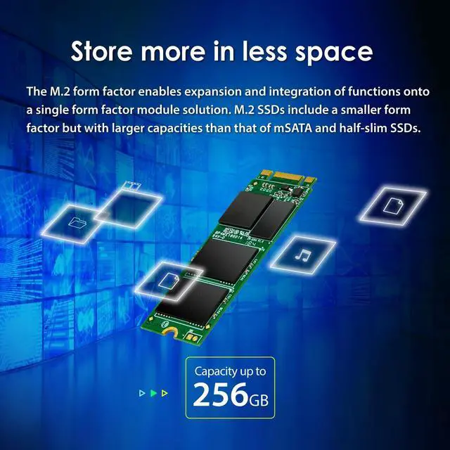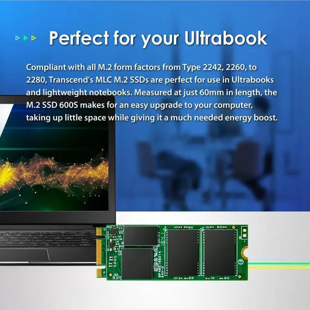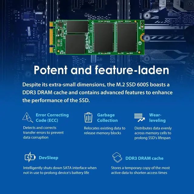 Transcend's SATA III 6Gb/s M. 2 SSD 600S boasts ultra compact dimensions to address the high performance needs and strict size limitations of small form factor devices, best suited for Ultrabooks and thin, light notebooks. Featuring a powerful controller, exceptional transfer speeds, and MLC NAND flash memory, the M. 2 SSD 600S easily handles everyday computing tasks as well as demanding multimedia applications, delivering steadfast reliability.