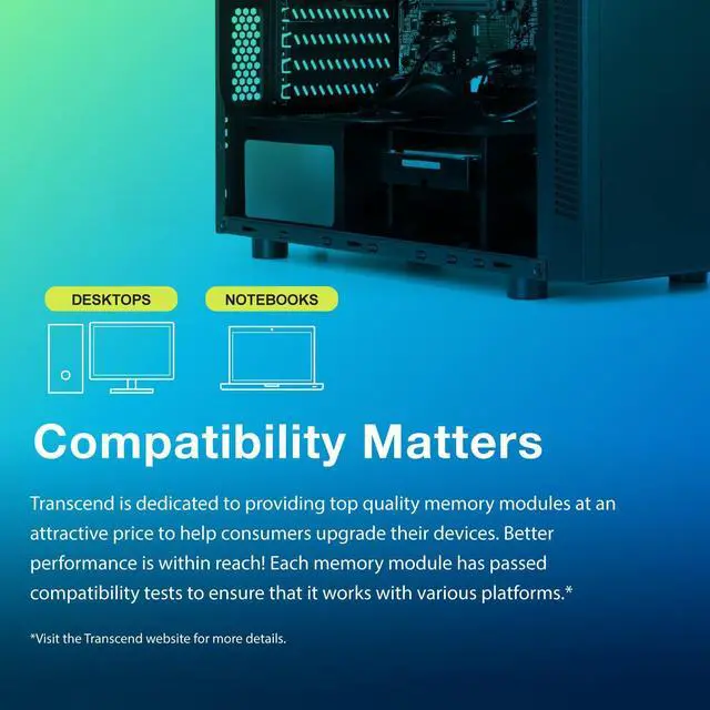 Transcend offers a comprehensive range of DDR4 standard long-DIMMs and compact SO-DIMMs to enhance memory bandwidth for desktops and laptops alike. All modules are tested across various motherboard platforms and operating systems with achieving maximum compatibility in mind.