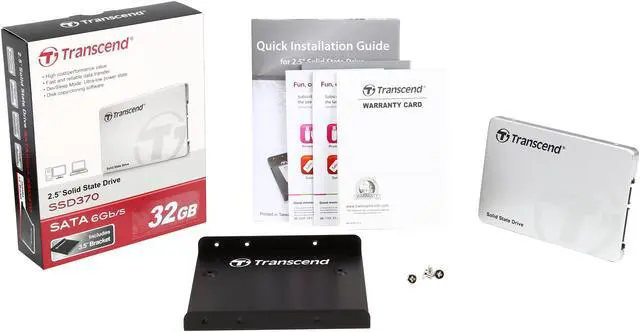 2.5 SSDs SATA III 6Gb/s SSD370 (Premium) All the speed is back and even faster. Transcend's SSD370 SATA III 6G/s SSD boasts incredibly fast transfer speeds, large capacities of up to 1TB, a compact and lightweight design, shock and vibration resistance, and supports DevSleep mode. That means you can enjoy a seamless, lag-free computing experience even when using your notebook on an extended journey. More space. More to store.Besides the blazing transfer speeds, the SSD370 ranges from 32GB to 1TB capacities that helps you save time to drag and delete files and process large multimedia files within seconds.Save power. Fast response. The SSD370 maximizes notebook battery life when not in use thanks to the full support of SATA Device Sleep Mode (DevSleep). DevSleep ultra low power state conserves more battery power th..."Storage Capacity: 32 GBDrive Interface: SATADrive Interface Standard: SATA/600Drive Type: InternalDrive Width: 2.5Height: 0.3"Width: 2.8"Depth: 3.9"Weight (Approximate): 2.05 ozLimited Warranty: 3 Year"