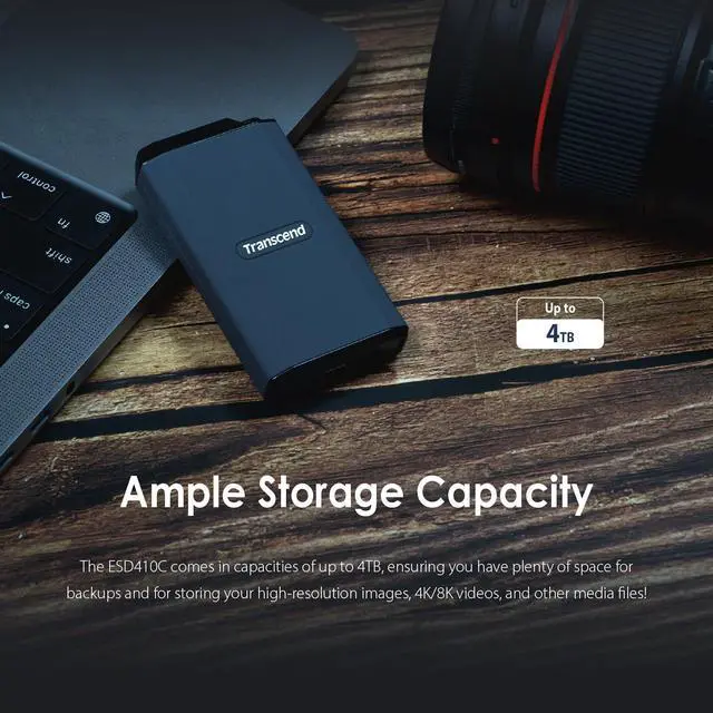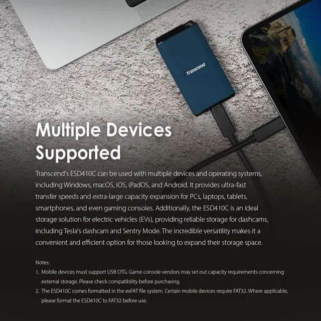 Please do not drop or strike the product arbitrarily. Ample Storage CapacityThe ESD410C comes in capacities of up to 4TB, ensuring you have plenty of space for backups and for storing your high-resolution images, 4K/8K videos, and other media files! Multiple Devices SupportedTranscend's ESD410C can be used with multiple devices and operating systems, including Windows, macOS, iOS, iPadOS, and Android. It provides ultra-fast transfer speeds and extra-large capacity expansion for PCs, laptops, tablets, smartphones, and even gaming consoles. The incredible versatility makes it a convenient and efficient option for those looking to expand their storage space.