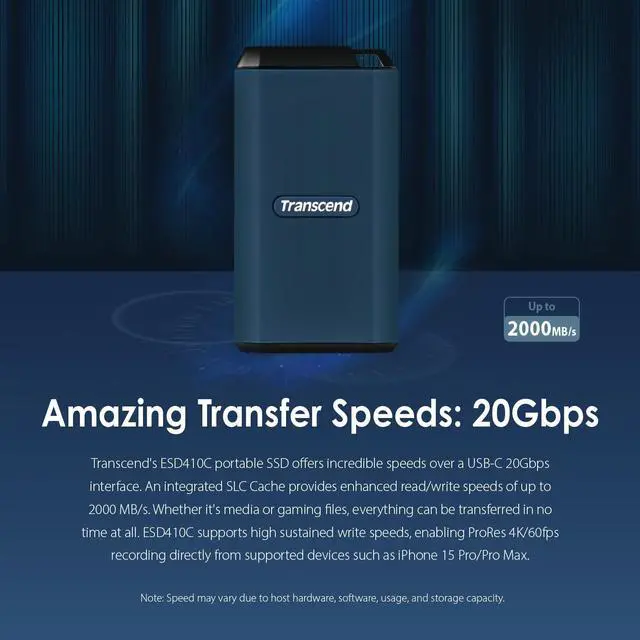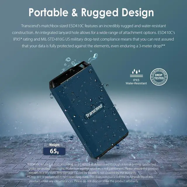 Amazing Transfer Speeds: 20GbpsTranscend's ESD410C portable SSD offers incredible speeds over a USB-C 20Gbps interface. An integrated SLC Cache provides enhanced read/write speeds of up to 2000 MB/s. Whether it's media or gaming files, everything can be transferred in no time at all. ESD410C supports high sustained write speeds, enabling ProRes 4K/60fps recording directly from supported devices such as iPhone 15 Pro/Pro Max. Portable & Rugged DesignTranscend's matchbox-sized ESD410C features an incredibly rugged and water-resistant construction. An integrated lanyard hole allows for a wide range of attachment options. ESD410C's IPX5* rating and MIL-STD-810G US military drop-test compliance means that you can rest assured that your data is fully protected against the elements, even enduring a 3-meter drop! **rn*ESD410C is rated as IPX5 according to IEC 60529 as determined through internal testing conducted under controlled conditions. Protection against splashes is not permanent. Please refrain from dismantling the casing yourself and ensure that the product remains in a dry state. Any damage caused by liquids is not covered by the warranty. **Drop test is performed in non-operating state. This does not guarantee the invulnerability of this product under any circumstances.