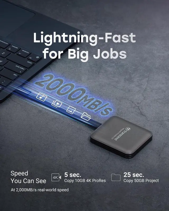 Amazing Transfer Speeds: 20GbpsTranscend's ESD420 portable SSD offers incredible speeds over a USB 20Gbps interface. An integrated SLC Cache provides enhanced read/write speeds of up to 2, 000 MB/s. Whether it's media or gaming files, everything can be transferred in no time at all. ESD420 supports high sustained write speeds, enabling 4K ProRes recording directly from supported devices such as iPhone. *ProRes is a trademark of Apple Inc. **Speed may vary due to host hardware, software, usage, and storage capacity. Tough Build. Trusted Performance. Engineered to MIL-STD-810G standards, Transcend's ESD420 portable SSD keeps your data safe— even on the roughest journeys. *Drop test is performed in non-operating state. This does not guarantee the invulnerability of this product under any circumstances. Please do not drop or strike the product arbitrarily. Travel Light. Store More. Weighing only 48g, Transcend’ s ESD420 fits right in the palm of your hand. Its compact size makes it easy to slip into your pocket or bag— perfect for carrying on the go without any extra burden. Big Files? Bring It On.