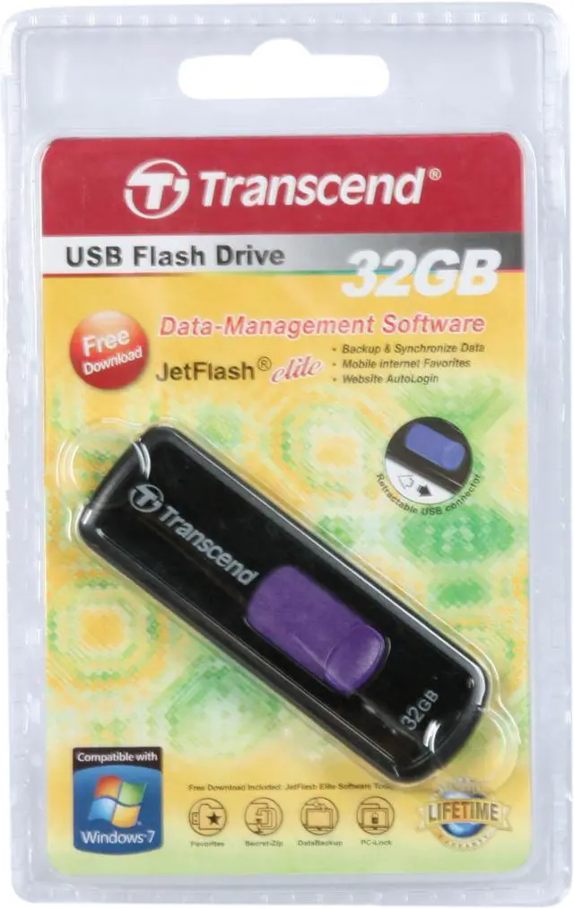 Losing USB end caps can be quite annoying, not to mention the inconvenience of taking the cap on and off every time the drive is used. For extra convenience and protection, the JetFlash 500 flash drive is designed with an innovative extension and retraction mechanism that enables users to bring out or hide the connector with a single flick of the thumb. Its capless design not only keeps dust and debris out of the drive, but also ensures there is no cap to misplace or lose.Storage Capacity: 32 GBHost Interface: USB 2.0Color: PurpleForm Factor: ExternalHeight: 0.3Width: 0.8"Length: 2.5"Weight (Approximate): 0.35 ozLimited Warranty: Lifetime"