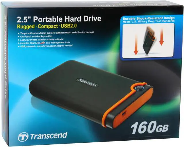 So, Transcend rides to our rescue with a drive that is both inexpensive and durable, with storage up to 160 GB. With a special suspension system AND silicone armor on the case, this tough little drive meets the U.S. Military drop-test standards and is so stamped by the manufacturer. Powered by your USB 2.0 port so it doesn't need an external adapter, it has transfer rates of up to 480 Mbps. Additional features that I've run out of room to describe.