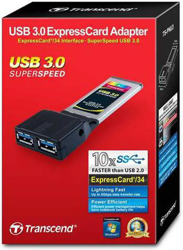 If you don't want to buy a new laptop for the sole purpose of adding USB 3.0 functionality, Transcend's USB 3.0 ExpressCard Adapter is a perfect solution. It allows you to add USB 3.0 ports to your existing laptop. With an ExpressCard/34 interface that works in virtually all current notebook computers, this easy-to-install card makes upgrading to USB 3.0 easier than ever before.