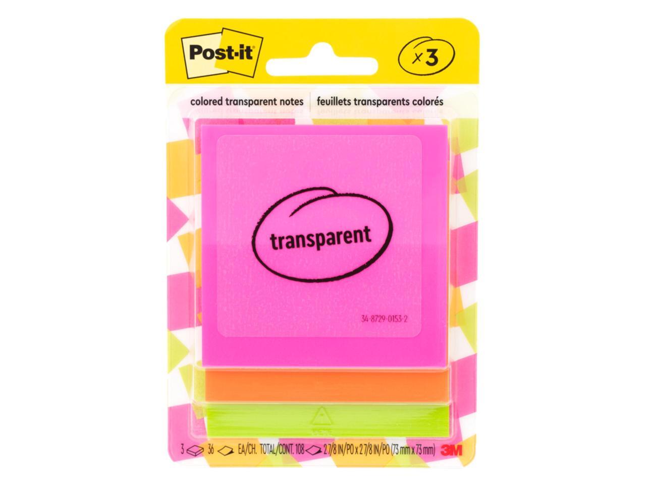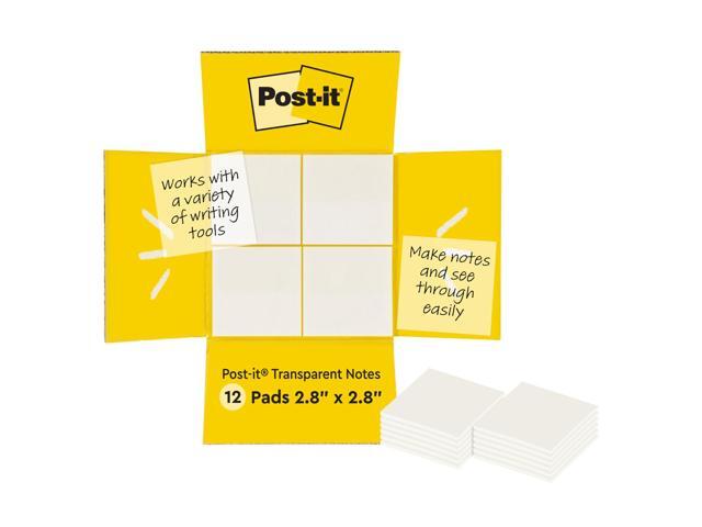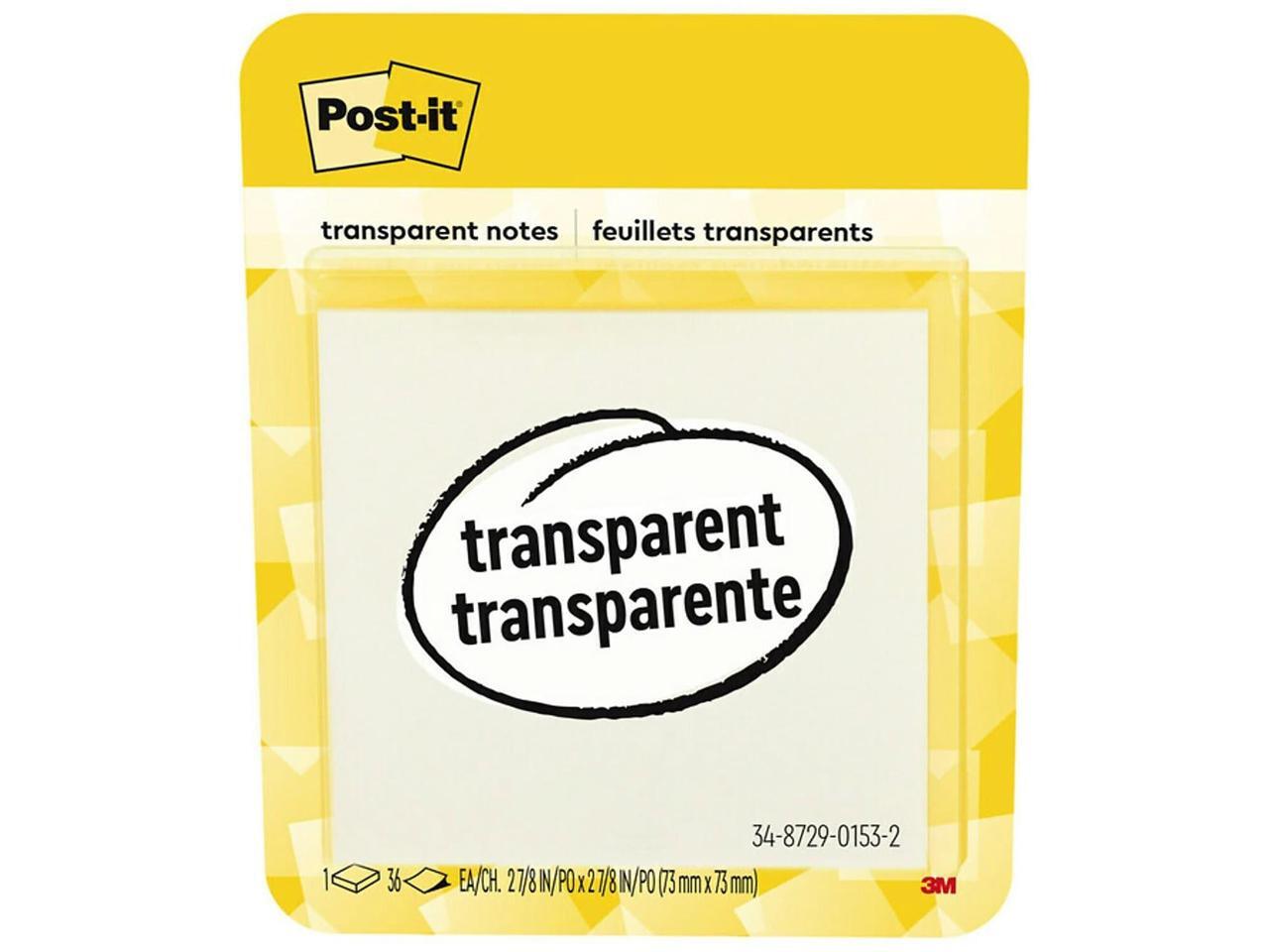 - GET ORGANIZED: Each pack includes 1 pad of 2.8 in. x 2.8 in. clear transparent notes, with 36 sheets per pad, great for your office, study area, or school classroom. TRANSPARENT STICKY NOTES: Clear Post-it Notes Transparent are the perfect note taking solution to highlight or call out specific content. SUSTAINABILITY: Post-it Transparent Notes are made with a film that has more than 55% recycled plastic.