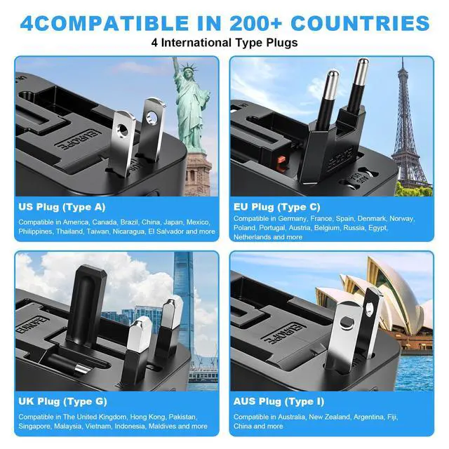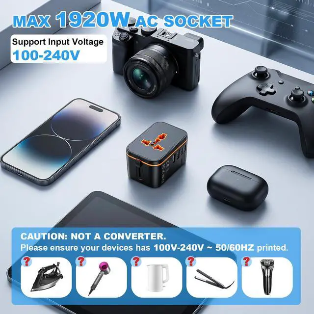 This power charger as a travel plug adapter, not a voltage converter. Please Ensure that the devices plugged into the adaptor are rated for the local voltage. Don’t use high appliance higher than max power rate, max. 8A.
