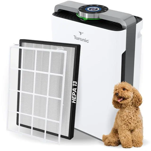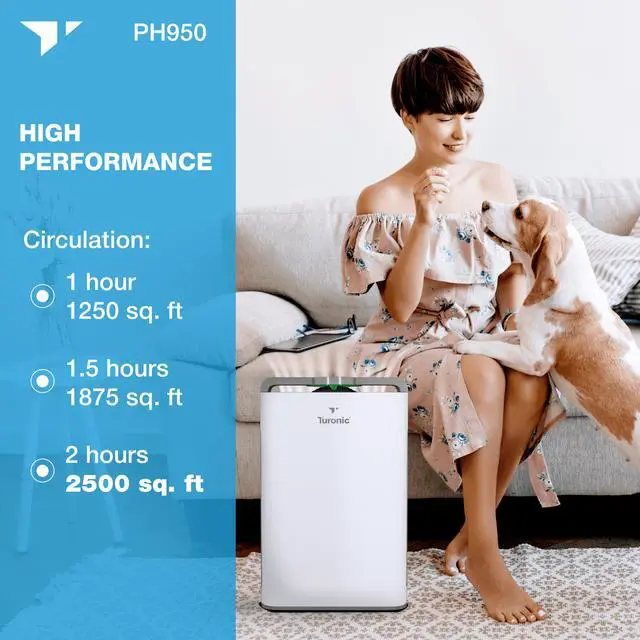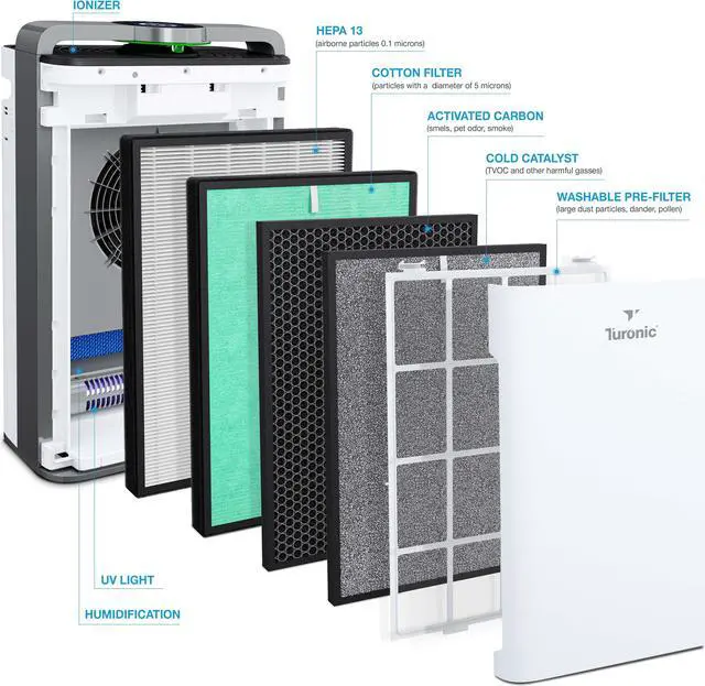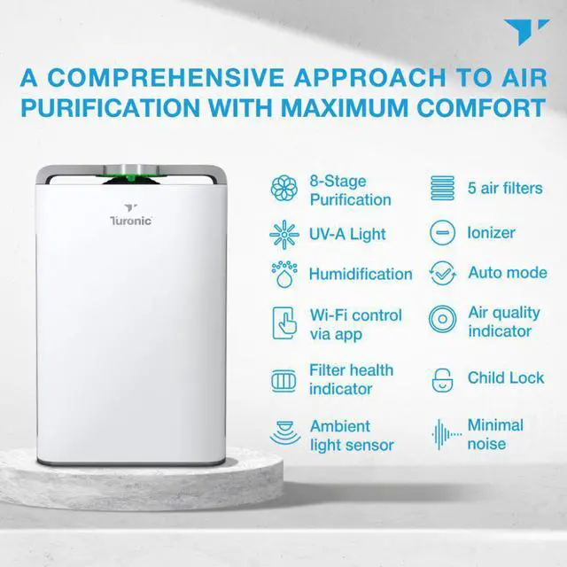 Turonic PH950 Hepa Air Purifiers for Home w/Humidifier. Key Features - 8-Stage Purification - Crafted with 5 air filters including True HEPA 13, activated carbon, cold catalyst, cotton filter, and mesh prefilter. Also includes a humidifier, UV light, and ionizer. - Moisturizing Humidifier - Purifies air while maintaining a comfortable level of humidity. Keeps furniture + surfaces dry. - Smart Auto Mode - Auto mode with a laser sensor to detect pollution levels and regulate through 8 different speeds in response to air quality. - Silent Operation - Light sensor to turn the device to sleep mode in darkness.