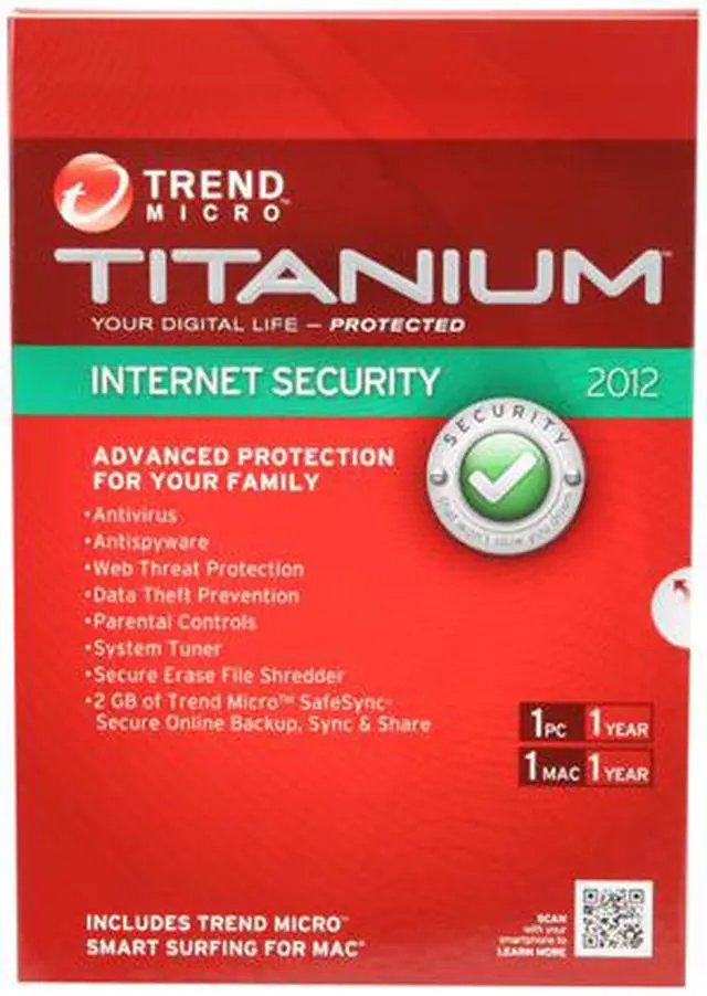 | Feature | Strong, fast and easy-to-use Trend Micro Titanium Internet Security provides protection for what you do online. It's an advanced security solution that safeguards you, your family, and your data. Titanium uses cloud technology to proactively stop viruses, spyware, and other threats before they reach your computer, so it won't slow you down. It's the same technology we use to protect some of the world's biggest businesses. Now, it's available to you and includes parental controls, data theft prevention, secure online storage, and more. With Trend Micro Titanium Internet Security, your digital life is protected. Automatically stops threats before they reach your computer Uses less than half the disk space and memory of competing security products Monitors and limits kids' online activity and access to inappropriate content Keeps your information like credit card numbers and passwords private Allows storing and sharing up to 2 GB of your precious photos, documents and more in the cloud Protects your Mac devices Strong protection made simple From the main Titanium console screen, you can run a scan or get up-to-theminute status reports on your computer's security. Maximize PC performance System Tuner improves your PC's performance by cleaning out temporary files, browser history, registries, and more. Easy, adjustable parental controls Protect your children from inappropriate websites and limit their time online. Data theft prevention Prevent hackers and spyware from stealing sensitive data like credit card numbers, passwords, and email addresses. |