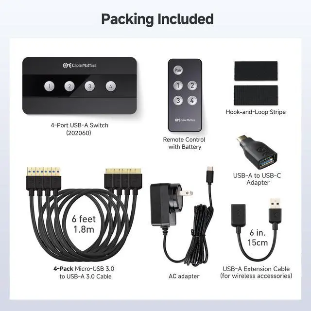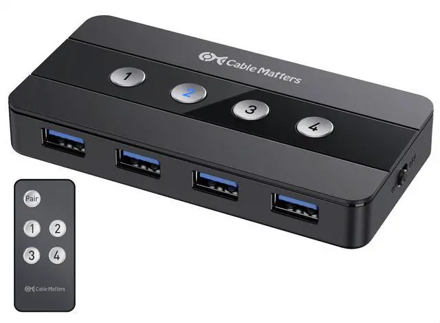 The Cable Matters USB 3.0 Switch is the ultimate accessory for a multiple-device workstation. Share high-speed USB 3.0 and USB 2.0 peripherals between up to four of your devices, eliminating the need for separate pairs of keyboards, mice, and printers for each computer.