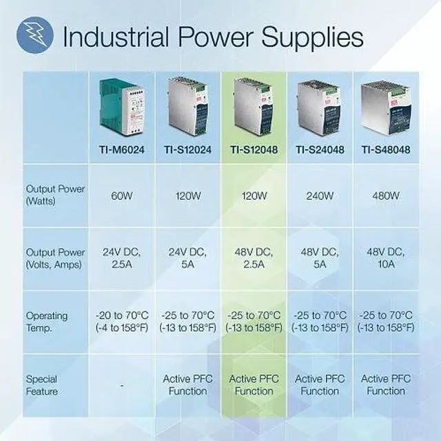 TRENDnets high efficiency 120 W Single Output Industrial DIN-Rail Power Supply, model TI-S12048 (Mean Well SDR-120-48), supplies up to 120 Watts (48 V, 2.5 A) of power to industrial PoE equipment such as switches, network cameras, and WiFi access points. This power supply comes with active PFC, an integrated DIN-rail mount, and overload current protection.
