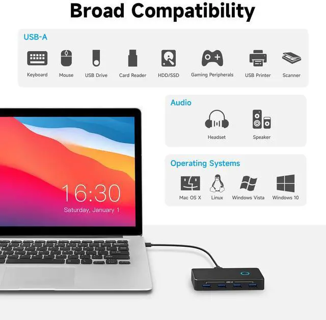 - 2-IN-5---4 USB 3.0 Ports+3.5mm Audio Jack, Share 5 Peripheral devices between two systems.