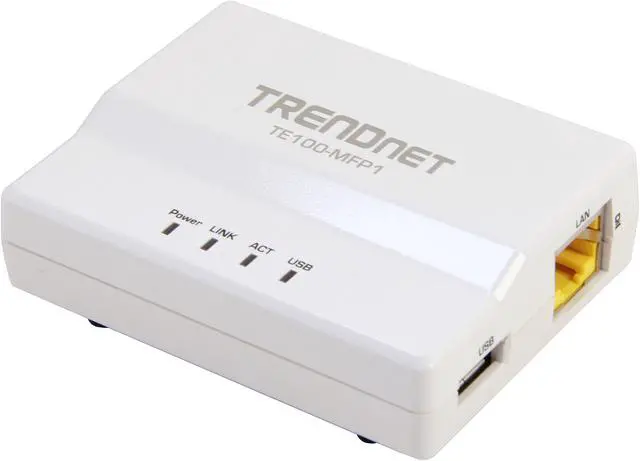 TRENDnet’s 1-Port Multi-Function USB Print Server, model TE100-MFP1, transforms most stand-alone multi-function and standard USB printers into a shared network resource. Install your multifunction printer in the most ergonomic location and then connect the compact TE100-MFP1 to a wired network.