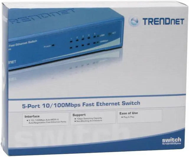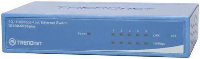 TE100-S55Eplus, 5-port 10/100Mbps Fast Ethernet Switch, presents the perfect choice for small workgroups for any desktop space. It allows users to simply plug any port to either a 10Mbps or 100Mbps network to multiply bandwidth, boost response time and satisfy heavy load demands. The ports automatically negotiate between half- and full-duplex modes, and Auto-MDIX media types.