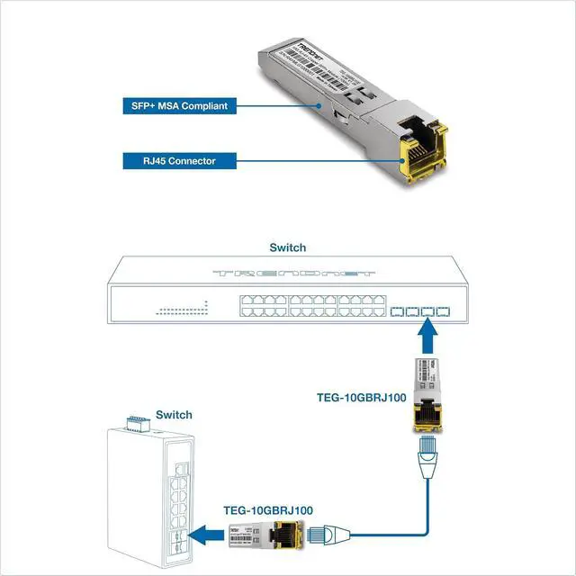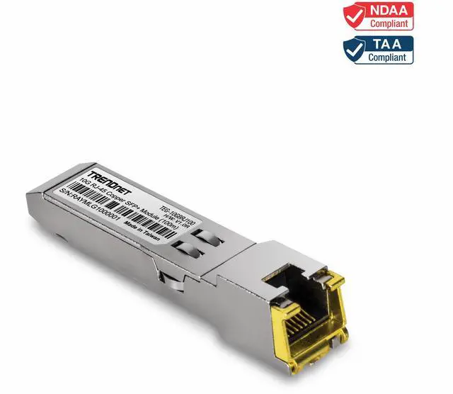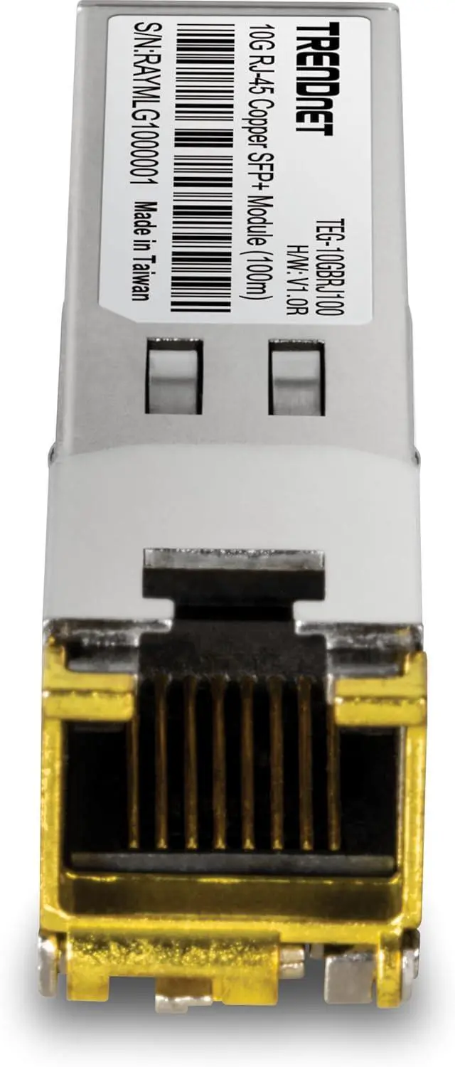 TRENDnets 10G RJ45 Copper SFP+ Module, model TEG-10GBRJ100, converts a standard SFP+ port into an RJ45 multi-gigabit port
