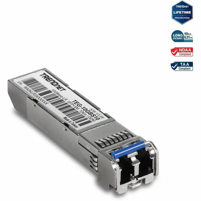 TRENDnets hot-pluggable TEG-10GBS10, 10GBASE-LR SFP+ Single Mode LC Module, works with a MSA compliant SFP+ slot. This Single Mode transceiver spans distances up to 10 km ( 6.2 miles), comes with a LC duplex connector, and supports up to 10.5 Gbps networking throughput speeds. Digital Diagnostics Monitoring (DDM) captures critical device parameters such as transmit/receive power, temperature, and voltage.
