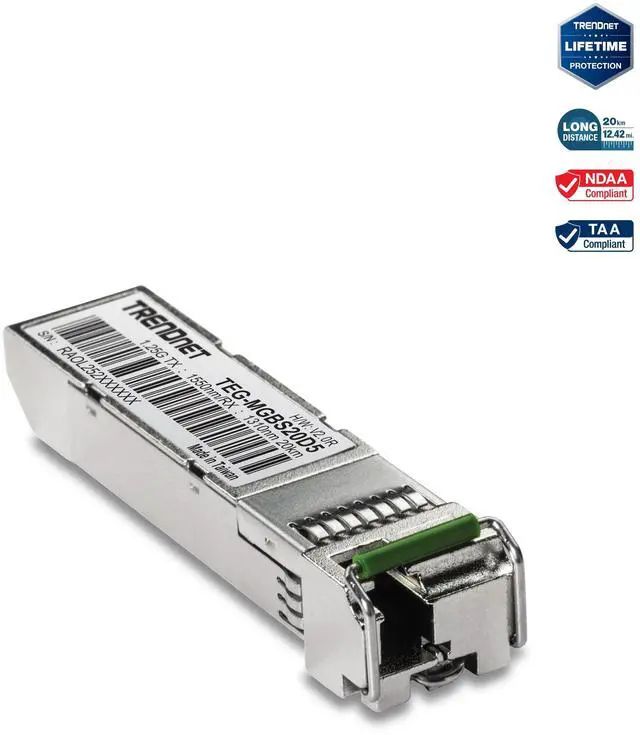 TRENDnets TEG-MGBS20D5 when paired with the TEG-MGBS20D3 creates a long distance, single strand fiber solution with a range of up to 20 KM ( 12.4 miles). Alternatively grow your pre-existing two-strand fiber connection, and turn it into two separate single-strand fiber connections. The SFP interface is compatible with standard SFP slots and offers a 1000BASE-LX SFP interface.