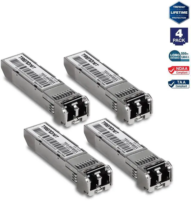 TRENDnet SFP Multi-Mode LC Module 4-Pack, TEG-MGBSX/4, Transmission Up to 550m (1804 Ft), Mini-GBIC, Hot Pluggable, IEEE 802.3z Gigabit Ethernet, Supports Up to 1.25 Gbps, Lifetime Protection