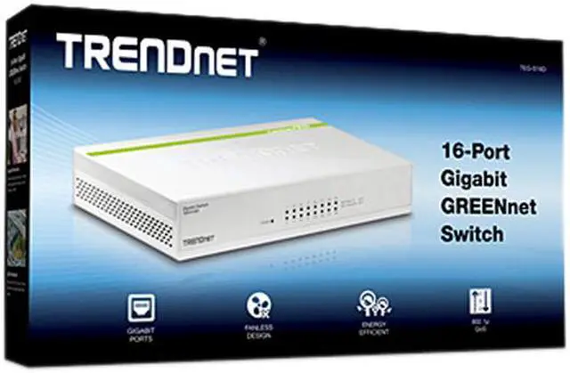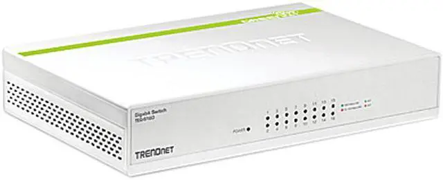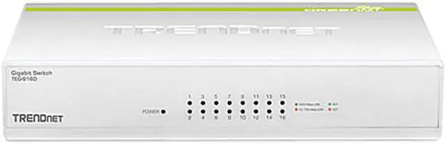 • TRENDnet's 16-Port Gigabit GREENnet Switch, model TEG-S16D, provides performance, proven reliability, and reduced power consumption. Embedded energy saving GREENnet technology works right out of the box with no management required. This fan less unmanaged desktop switch offers a total switching capacity of 32 Gbps and 802.1p Quality of Service traffic prioritization support.