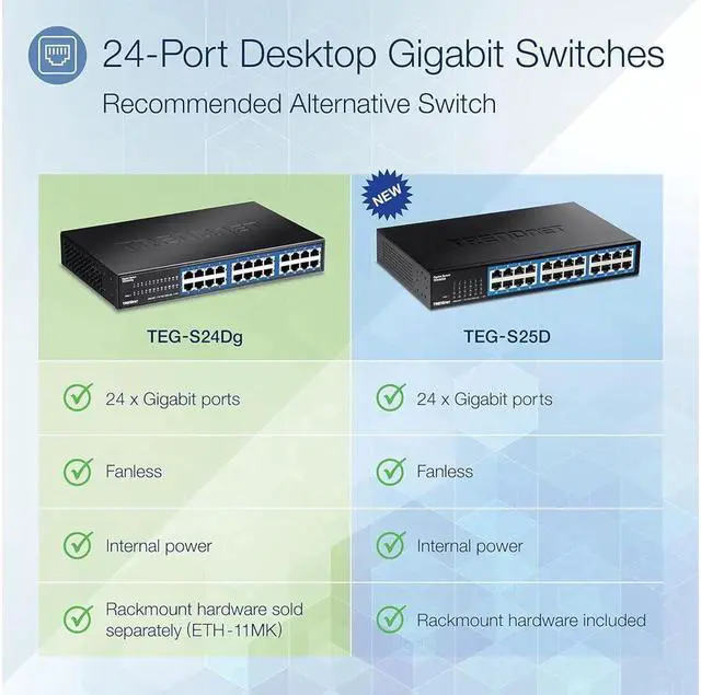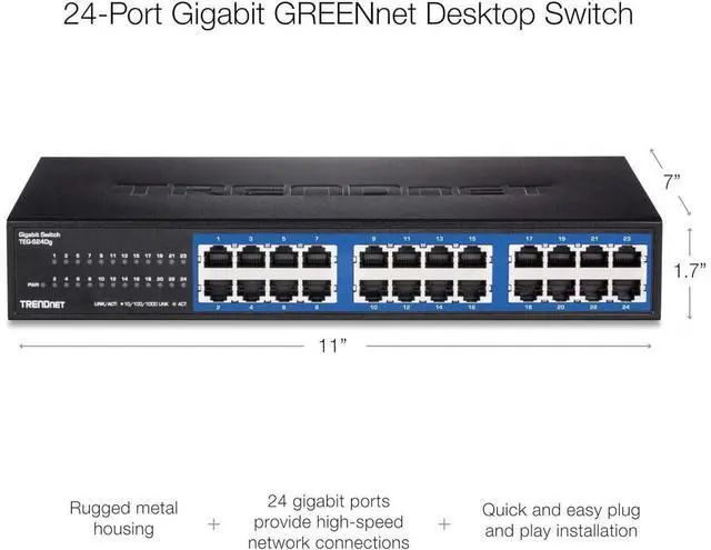 • ENERGY SAVINGS: The 24 Port Gigabit GREENnet Desktop Switch, model TEG S24Dg, provides high bandwidth performance, ease of use, and reliability, all while reducing power consumption by up to 70 percent. GREENnet technology automatically adjusts power consumption as needed, resulting in substantial energy savings. Embedded GREENnet technology works right out of the box with no management requirement.