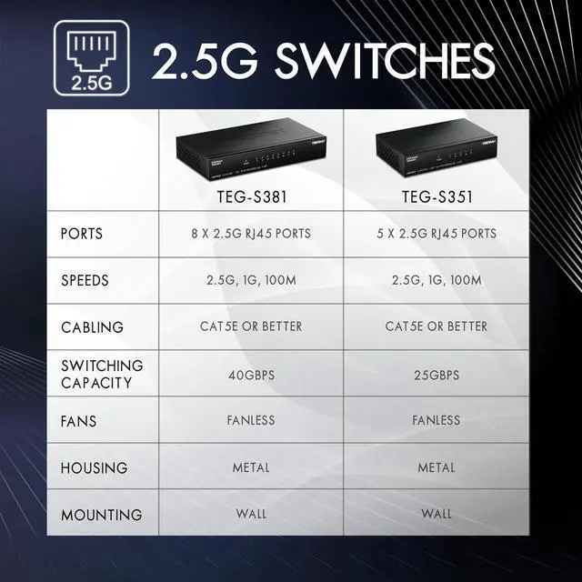 lexibility. The fanless design lowers energy consumption and eliminates operating noise. TRENDnets reliable 2.5G switch is a cost