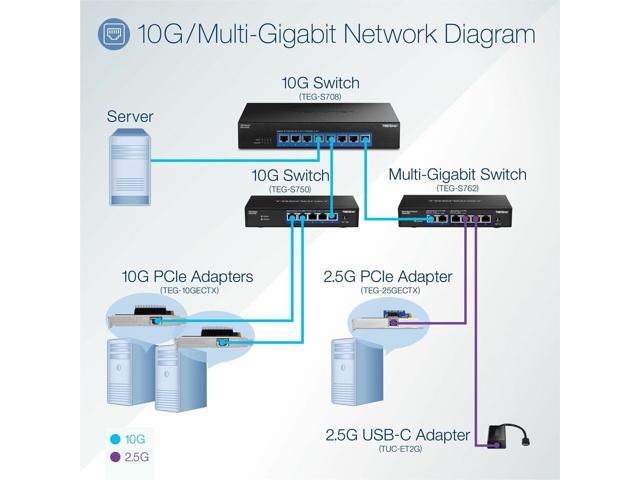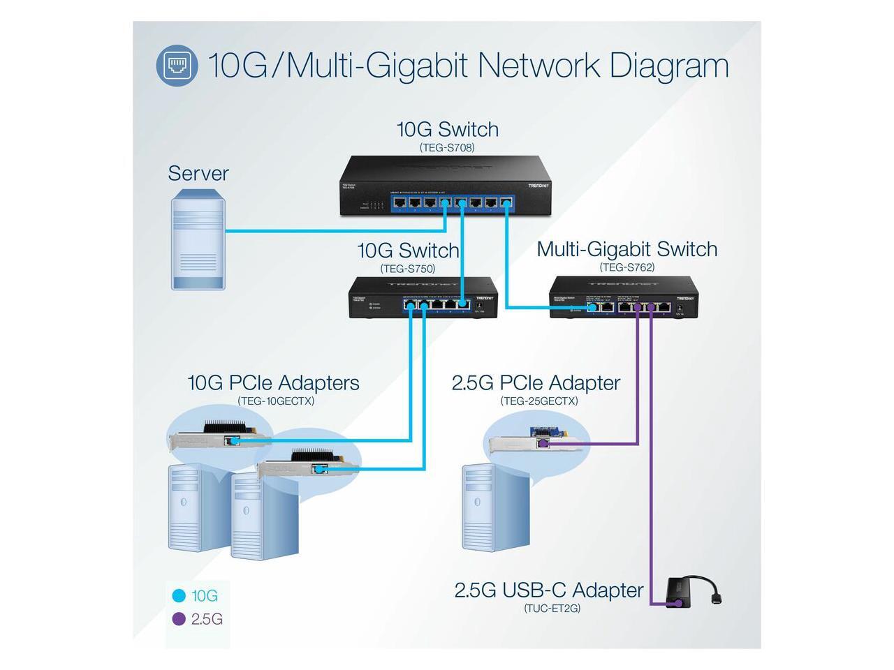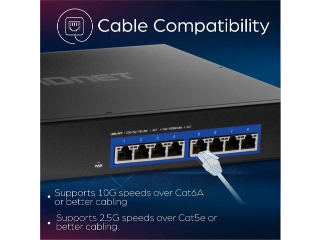 - Backward compatible Ethernet speeds of 1000Mbps and 2.5Gbps with Cat5e or better cabling