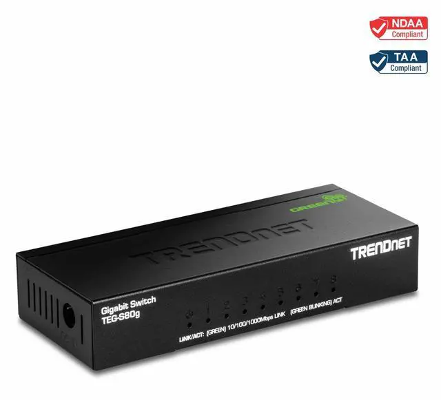 The 8-Port Gigabit GREENnet Mini Switch, model TEG-S80g, provides high-bandwidth performance, ease-of-use, and reliability, all from a tiny and durable metal enclosure, while reducing power consumption. GREENnet technology automatically adjusts power consumption as needed, resulting in substantial energy savings. Embedded GREENnet technology works right out of the box with no management requirement. TEG-S80g This space-saving metal mini switch is designed to fit into any desktop setup and is small enough to fit into your pocket. It’s ideal for both a minimalist desk setup or a desk packed with gear. Boost office network efficiency and eliminate network congestion with gigabit speeds and a total switching capacity of 16Gbps with full-duplex mode. Integrate this sturdy mini switch for reliable high-speed network connectivity.