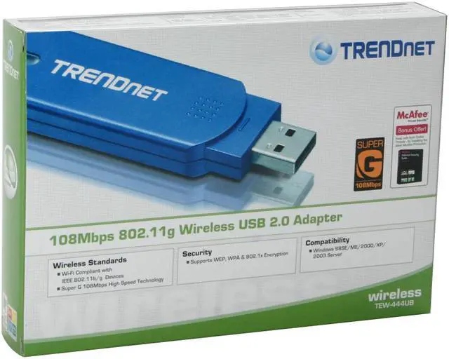 TEW-444UB Wireless Super G USB Adapter provides wireless connectivity with 802.11g, or 802.11b networks and an easy-to-install, backward compatible interface to bring the best wireless solution for desktop/mobile workstations. The TEW-444UB can reach blazing speeds of 108Mbps. It also dynamically encrypts wireless transmissions with WPA-PSK.