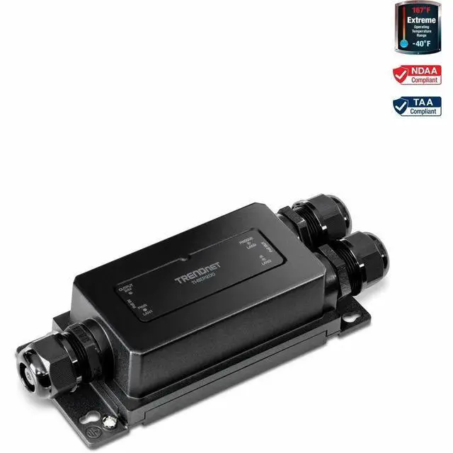 TRENDnets 2-Port Industrial Outdoor Gigabit PoE Extender, model TI-BEP200, takes a single PoE++ (90W) connection and