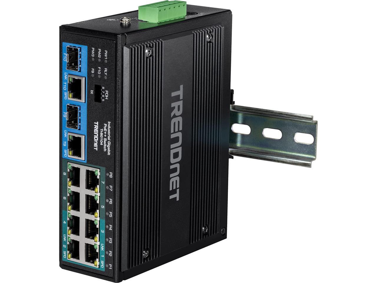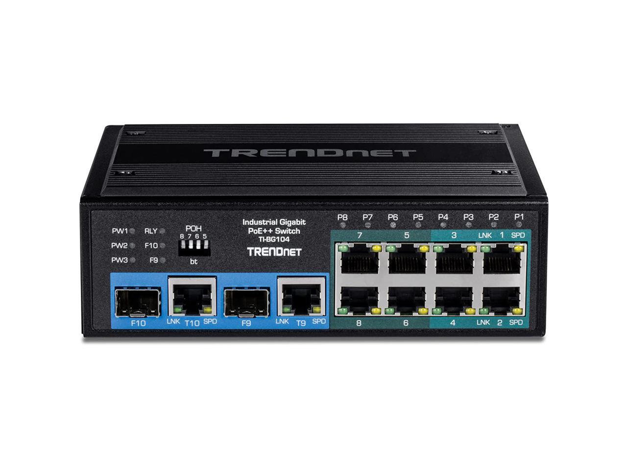 TRENDnet 10-Port Hardened Industrial Unmanaged Gigabit PoE ++ DIN-Rail Switch, 4 Gigabit PoE++ Ports, 4 Gigabit PoE+, 2 Gigabit Share Ports SFP or RJ-45, 360W Power Budget, TI-BG104