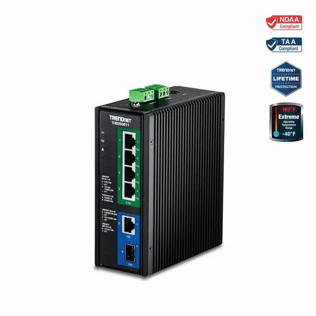 TRENDnet's 6-Port Industrial 2.5G PoE++ DIN-Rail Switch with 10G Ports, model TI-BG50611, delivers network connectivity to rugged environments, while saving you on installation costs and setup time using Power over Ethernet technology. The industrial multi-gigabit PoE++ switch features a rugged IP50 rated metal enclosure, designed to withstand a high degree of vibration and shock, while operating in both high and low temperatures for industrial environments within -40° 75° C (-40° 167° F). This hardened industrial PoE++ switch features four Ethernet 2.5G PoE++ ports, a 10G Ethernet port, and a 10G SFP+ port for long distance fiber networking applications.