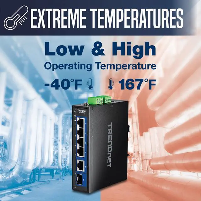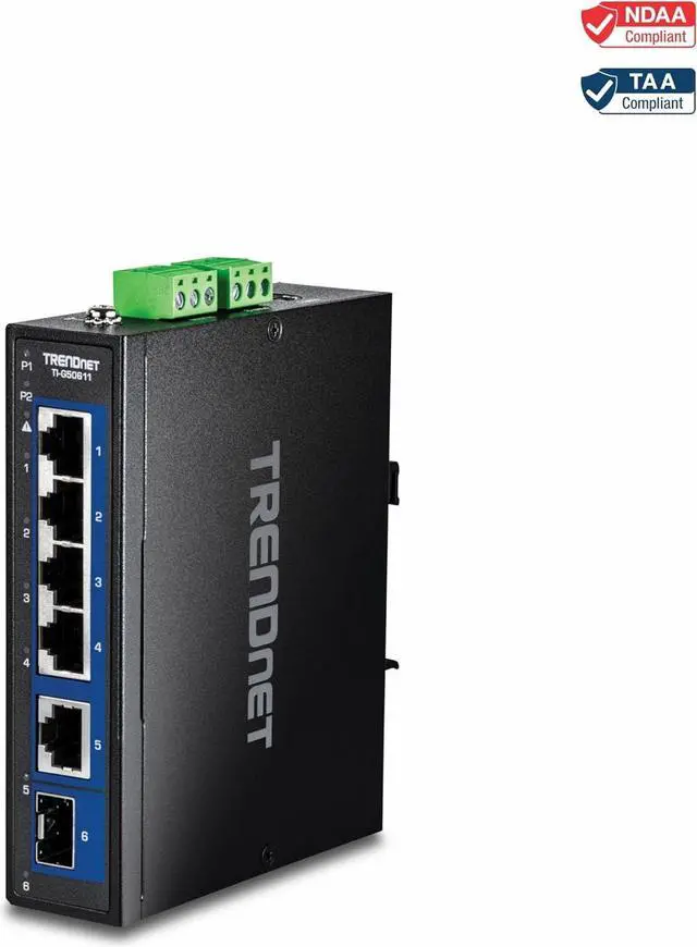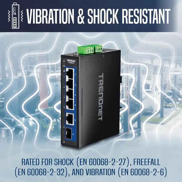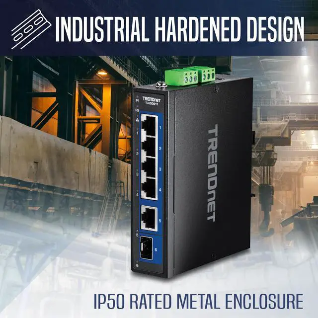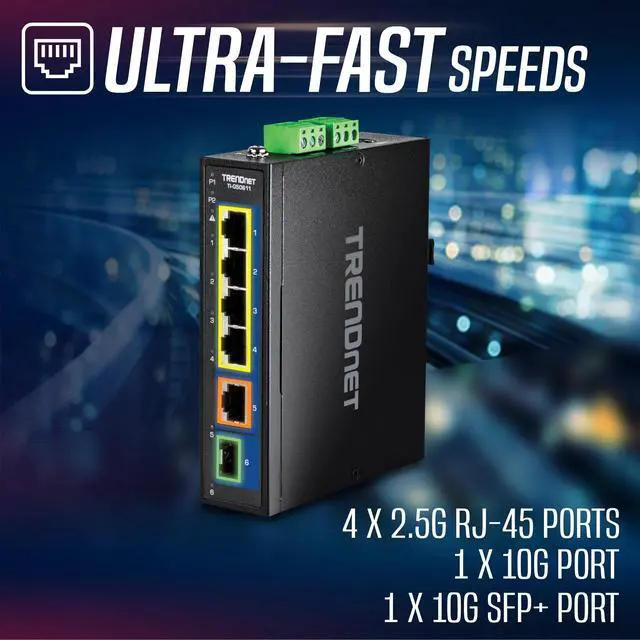 TRENDnets 6-Port Industrial 2.5G DIN-Rail Switch with 1 x 10G Port, model TI-G50611, features a rugged IP50 rated metal enclosure and is designed to work in the harshest networking environments. This industrial multi-gigabit switch is designed to withstand a high degree of vibration and shock, while operating in both high and low temperatures for industrial environments within -40° 75° C (-40° 167° F). Redundant power inputs with overload current protection, and a power failure alarm relay minimize network downtime. This multi-gig DIN-Rail network switch features 2.5G and 10G copper ports for high-speed device connections, and a 10G SFP+ port for backbone fiber networking applications.