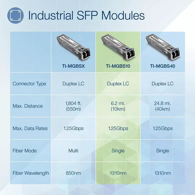 The 1000Base-LX Industrial SFP Single-Mode LC Module, model TI-MGBS10, is designed to operate within a wide temperature range and is well suited for industrial environments. This SFP module works with standard SFP slots found on industrial switches and fiber converters. The TI-MGBS10 is compatible with Duplex LC fiber connector types and supports gigabit single-mode fiber connections at distances of up to 10 kilometers ( 6.2 miles).