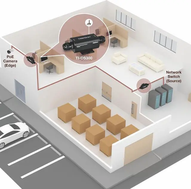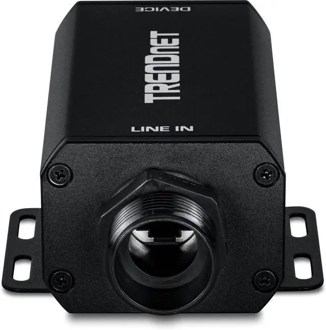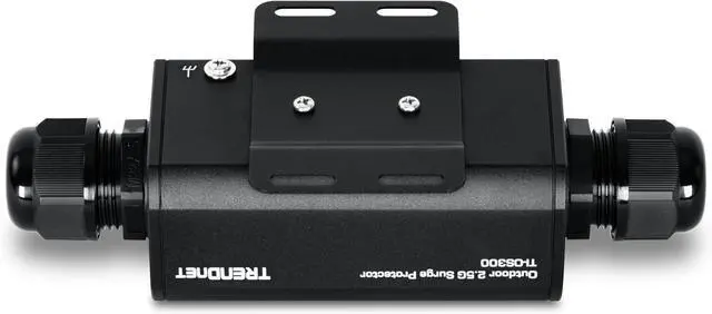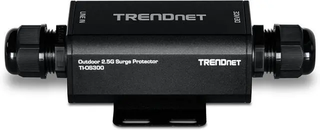 TRENDnets Outdoor 2.5G PoE++ Surge Protector, model TI-OS300, is installed inline using Ethernet cabling to protect and prevent damage to internal low voltage network devices from electrical surges caused by lightning strikes, electrical overloads, and faulty or damaged wiring. The surge protector supports up to 2.5G bps networking speeds and PoE++ (95W) devices. The surge protector also features an IP67-rated metal enclosure, detachable mounting bracket, Ethernet cable glands for water protection, and wide operating temperature range of -40° 75° C (-40° 167° F) suitable for outdoor installations.