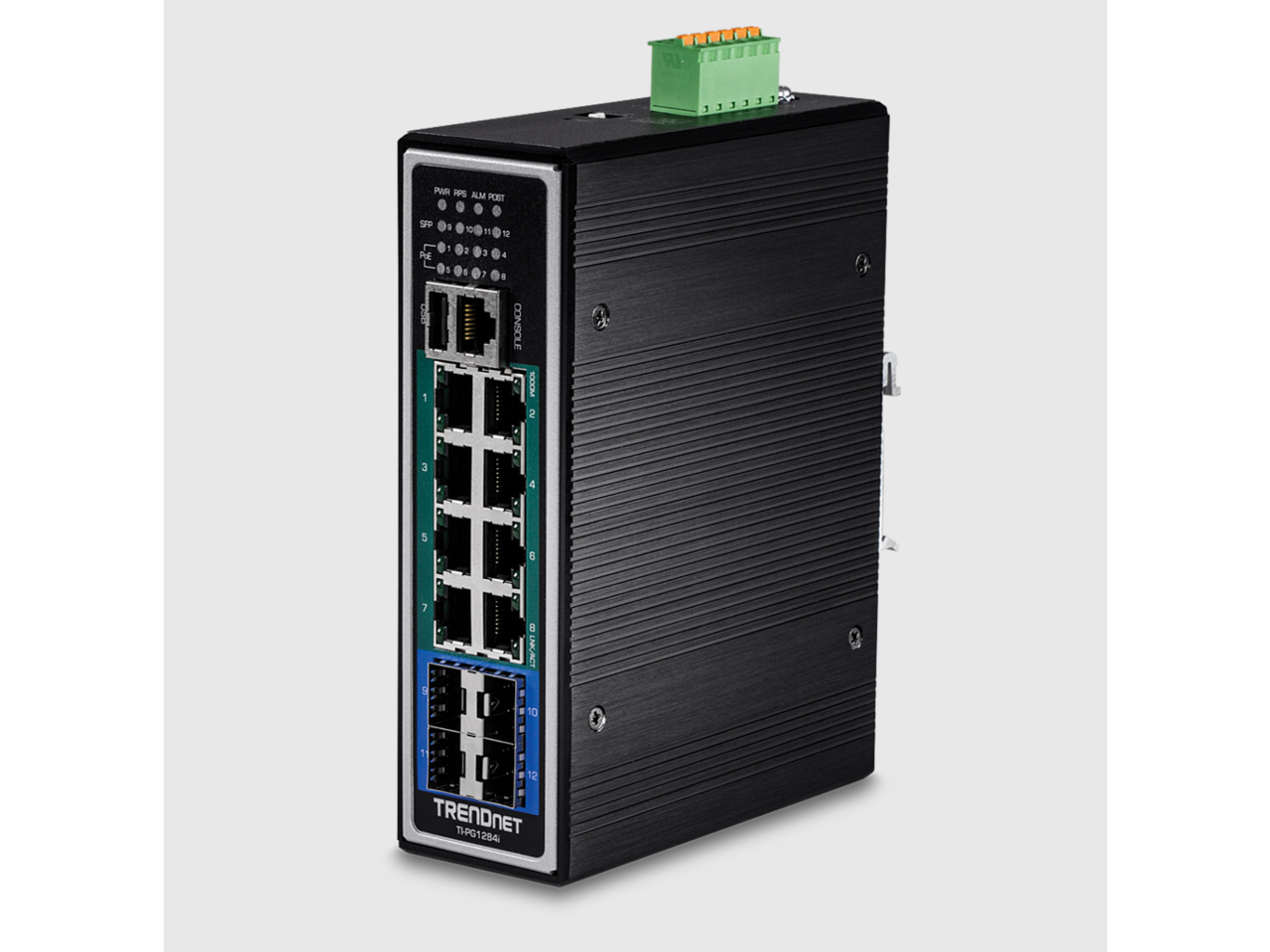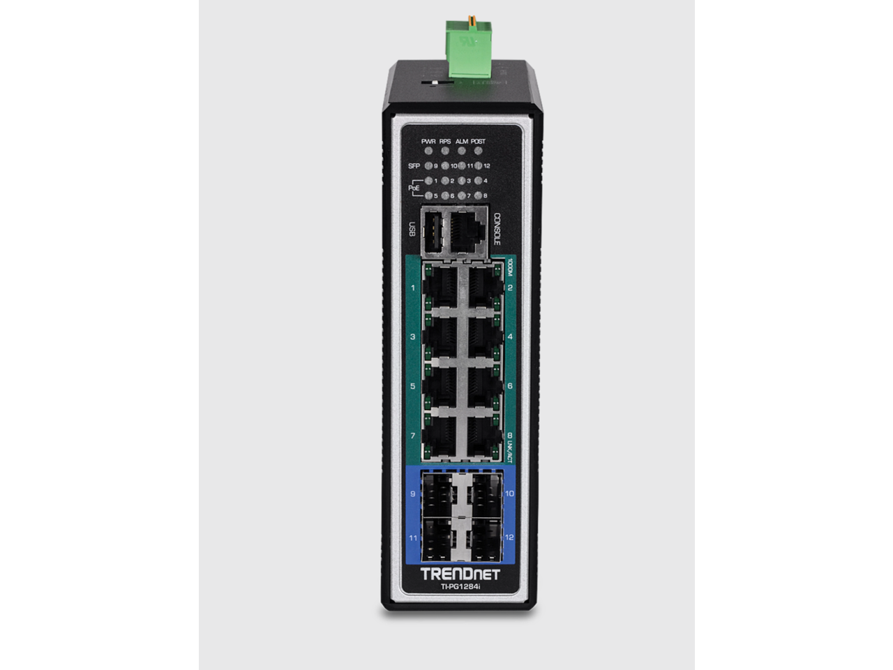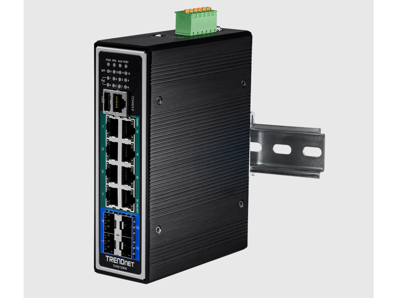 TRENDnet 12-Port Hardened Industrial Gigabit PoE+ Layer 2+ Managed DIN-Rail Switch, TI-PG1284i, 240W Power Budget, IP30 Rated, Ethernet Splitter, NDAA & TAA Compliant, Lifetime Protection, Black
