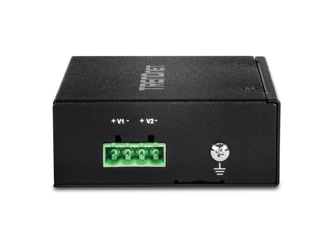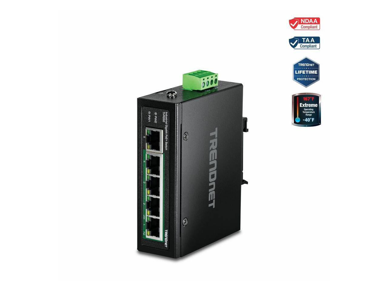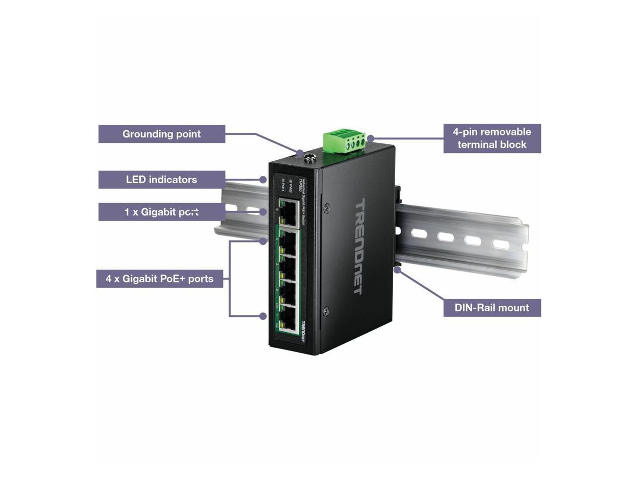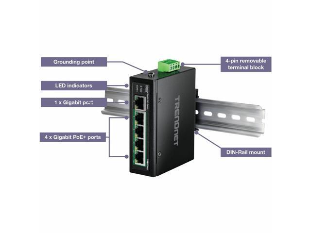 TRENDnet 5-Port Hardened Industrial Unmanaged Gigabit Switch, TI-PG50, 10/100/1000Mbps, DIN-Rail Switch, 4 x Gigabit PoE+ Ports, 1 x Gigabit Port, Gigabit Ethernet Network Switch