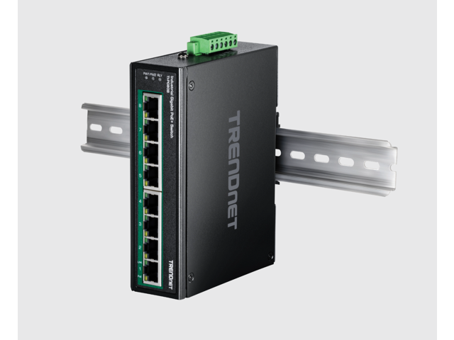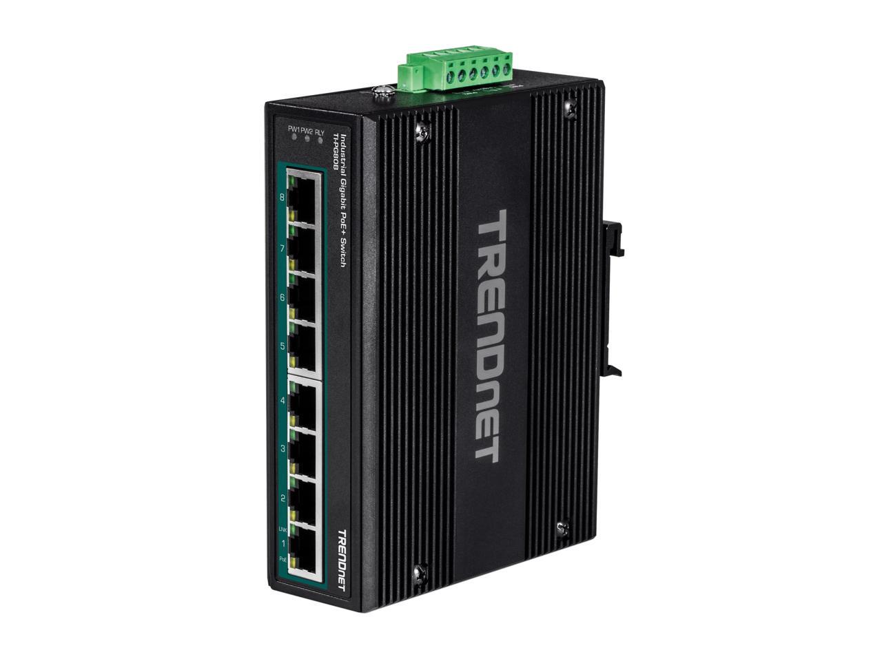 TRENDnet 8-Port Hardened Industrial Unmanaged Gigabit 10/100/1000Mbps DIN-Rail Switch w/ 8 x Gigabit PoE+ Ports, TI-PG80B, 24 - 56V DC Power inputs with Overload Protection