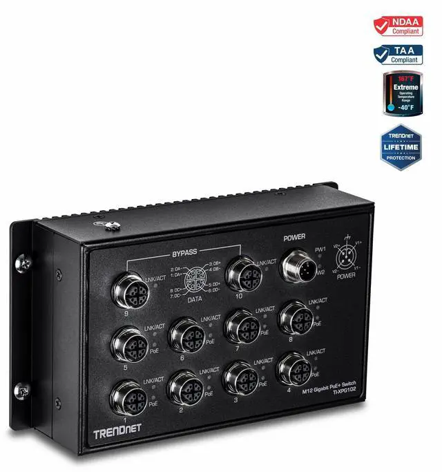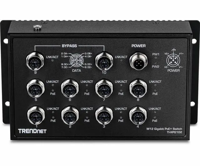 TRENDnets 10-Port Industrial EN 50155 M12 Gigabit PoE+ Railway Switch, model TI-XPG102, has eight M12 gigabit PoE+ ports, two M12 gigabit ports, and one M12 power port with a total PoE budget of up to 200W with 56VDC input. This M12 Ethernet switch is equipped with an IP40 rated metal enclosure, designed to withstand a high-degree of vibration and shock, while operating within an extreme temperature range of -40° 75° C (-40° 167° F) for industrial EN 50155 applications. The M12 Ethernet switch is designed and tested for bus, train, automobile, and telecom applications.