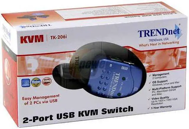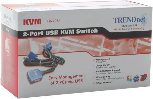 TRENDnet's TK-206i 2-Port USB KVM Switch Kit lets you control 2 USB enabled PCs with just one keyboard, monitor, and mouse. The KVM cables are built into the TK-206i so users can start controlling 2 PCs instantly. The TK-206i is a self-powered KVM Switch loaded with friendly features. With the Hot-Plug, Auto-Scan, and Hot-Key operations, the TK-206i is the perfect choice for managing multiple PCs.