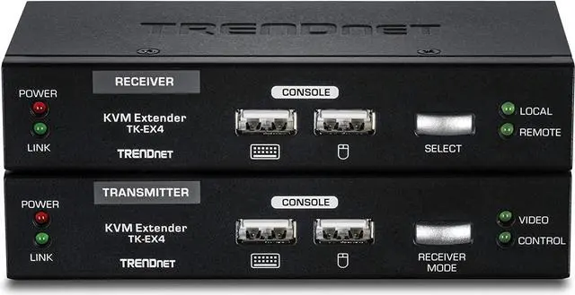 TRENDnet's USB VGA KVM Extension Kit, model TK-EX4, extends keyboard, video, and mouse controls for distances of up to 100m (328 ft. ). Remotely access your server in the networking room by extending KVM controls to your office. Connect the KVM extender to a TRENDnet KVM switch to conveniently control multiple servers from a remote location.