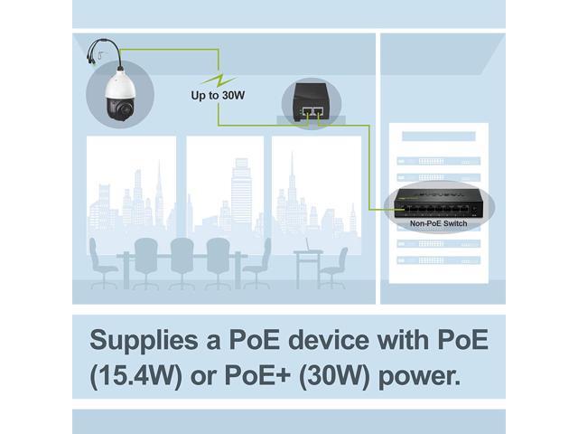 Supplies PoE (15.4W) or PoE+ (30W) power