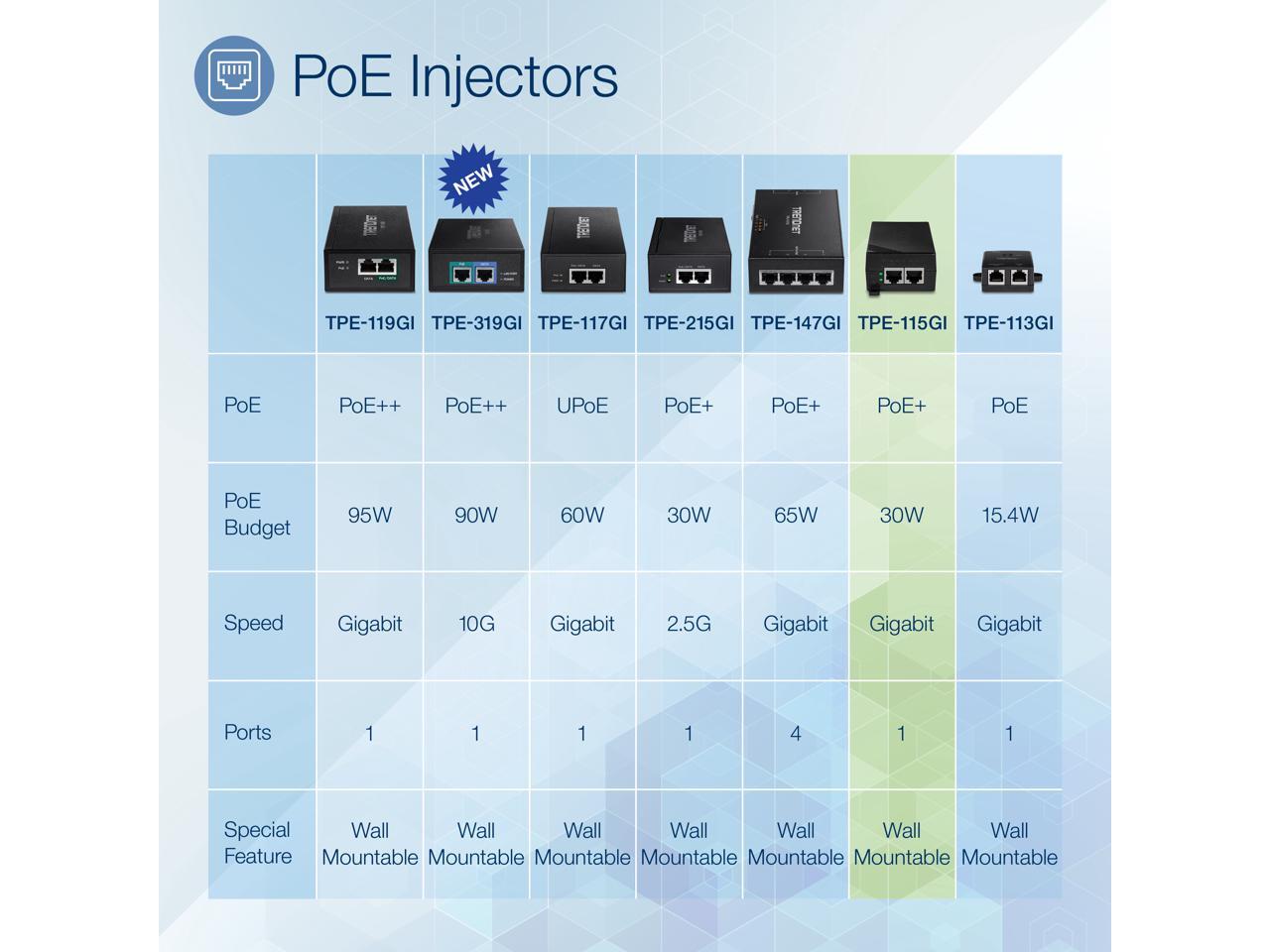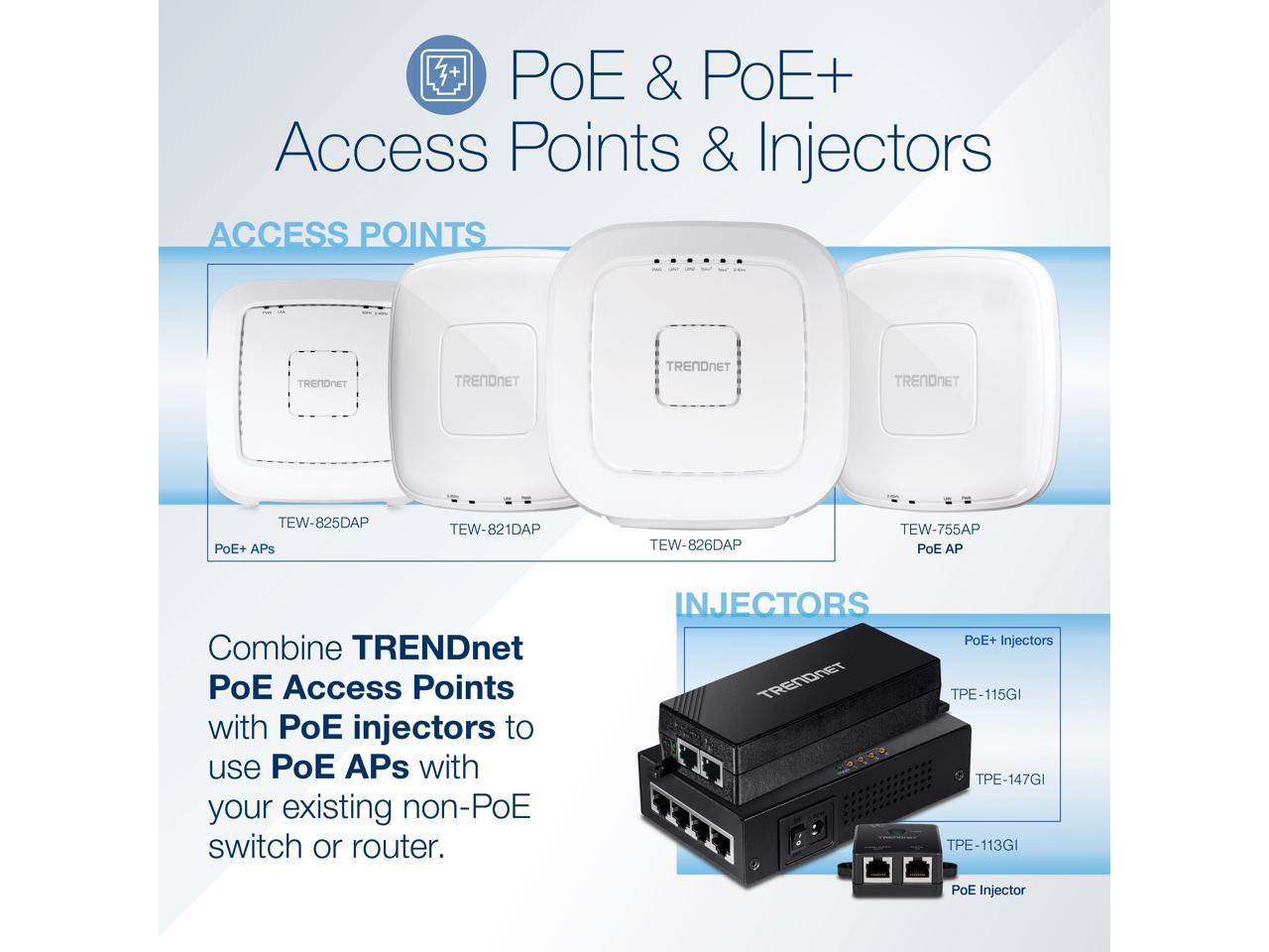 TRENDnet Gigabit Power Over Ethernet Plus Injector, Converts Non-Poe Gigabit To Poe+ Or PoE Gigabit, Supplies PoE (15.4W) Or PoE+ (30W) Power Network Distances Up To 100M (328 ft.), Black, TPE-115GI