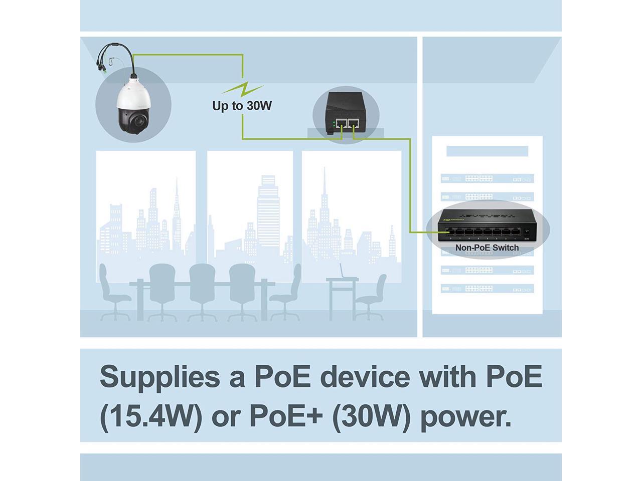 Converts a non-PoE Gigabit port to a PoE+ Gigabit port