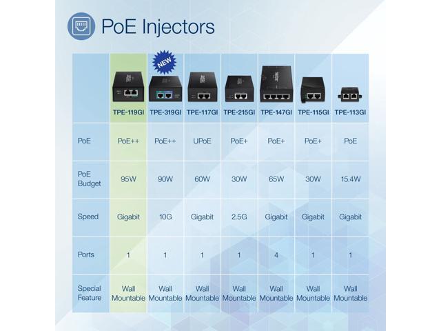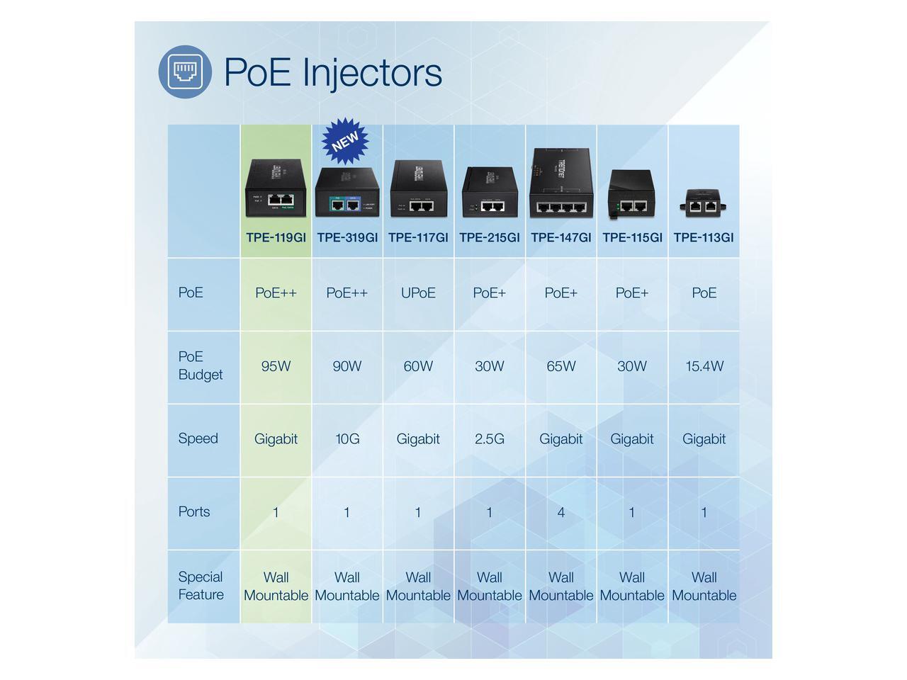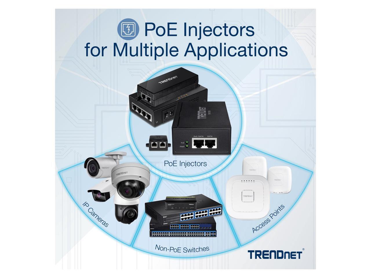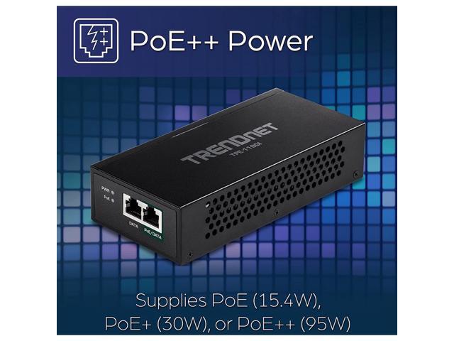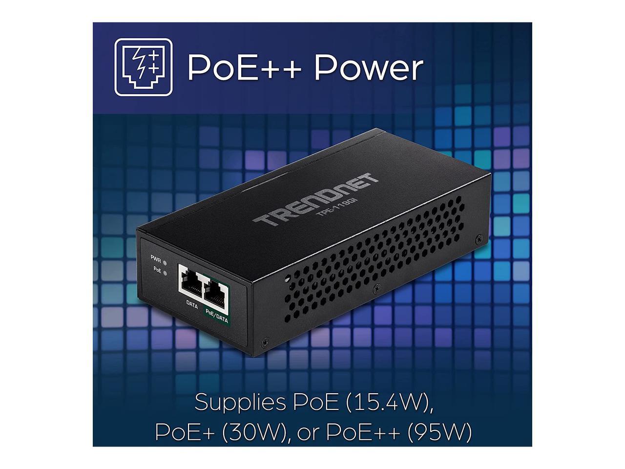 TRENDnet Gigabit PoE++ Injector, Convert A Non-PoE Port to A PoE++ Gigabit Port, PoE (15.4W), PoE+ (30W), Or PoE++ (95W), Up to 100m (328 ft), Integrated Power Supply, Black, TPE-119GI