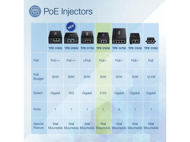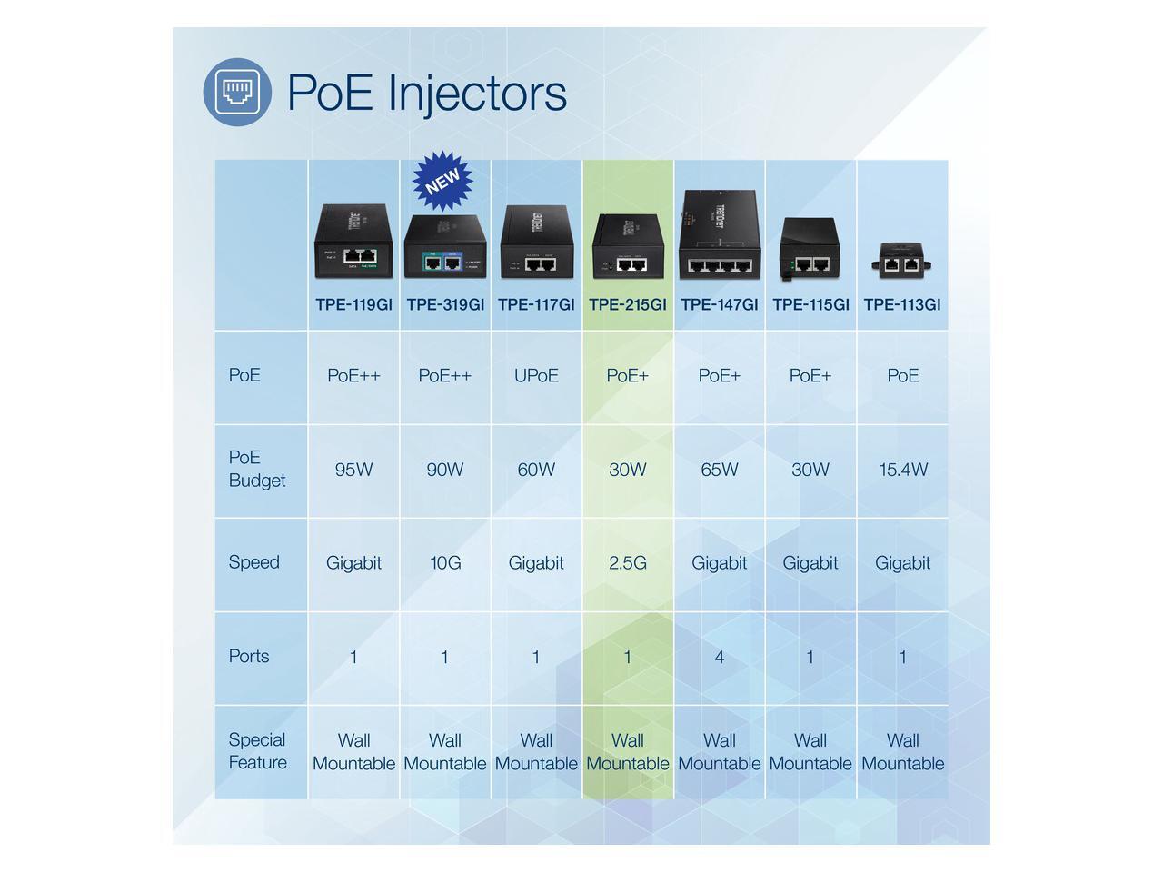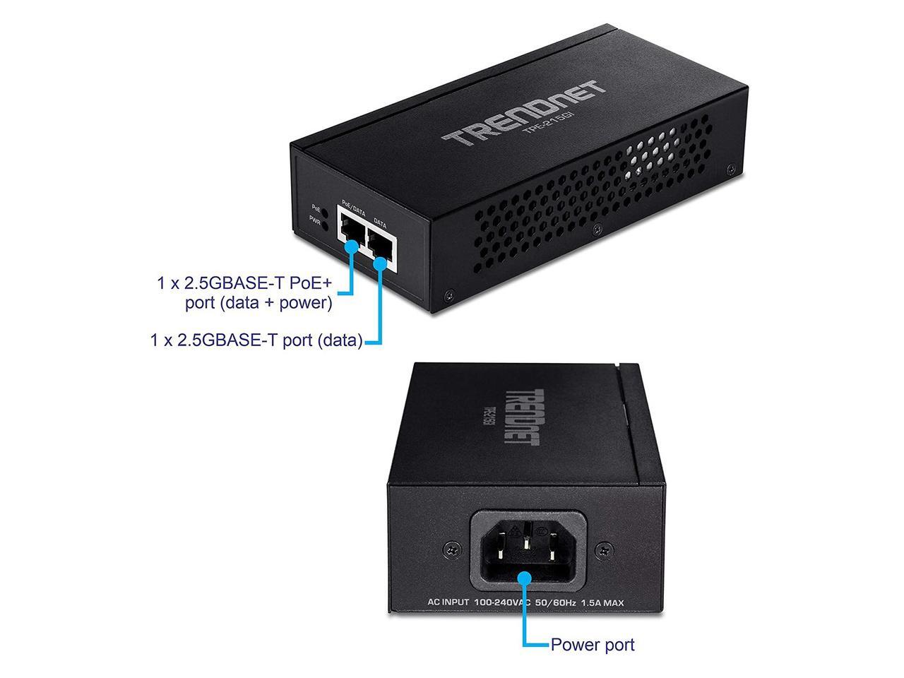 TRENDnet 2.5G PoE+ Injector, TPE-215GI, PoE (15.4W) or PoE+ (30W), Converts a non-PoE Port to a PoE+ 2.5G Port, 2.5GBASE-T Compliant, Integrated Power Supply, Network a PoE device up to 100m (328 ft.)